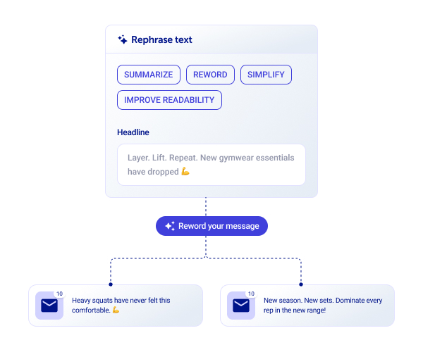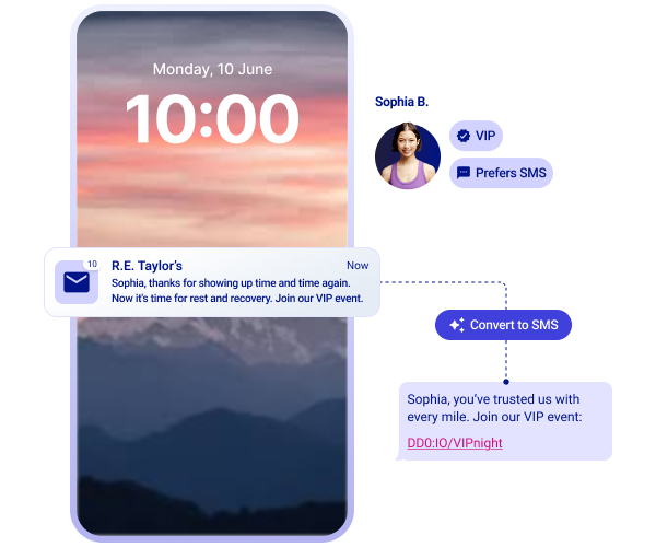 Reach your customers on their preferred channel without any extra work. Convert emails to SMS in one click. We’ll take care of character count and delivery.