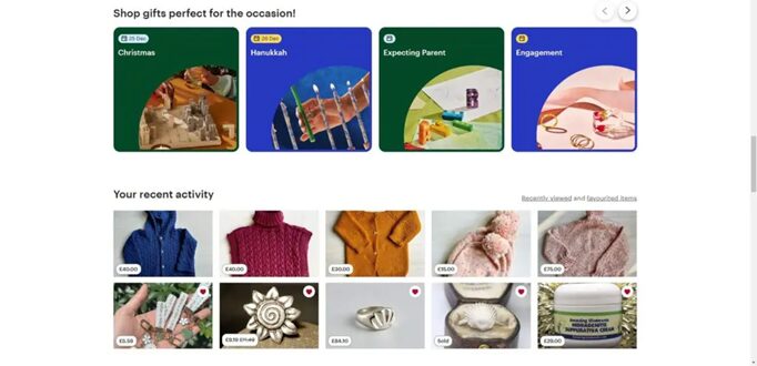 When a user visits Etsy’s homepage, they are welcomed with a personalized storefront reflecting their immediate interests and browsing history. This real-time personalization is shown through several key features: