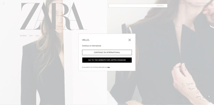 When customers visit Zara’s international site, they are immediately welcomed by a location-aware popover. The website intelligently detects the user’s geographic location and presents two primary options: continue browsing the international site or redirect to the country-specific site, such as the one for the United Kingdom.