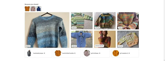 Because you viewed: This intelligent feature presents products related to items the user has engaged with recently. By doing so, Etsy demonstrates its ability to understand and anticipate user interests in real time, effectively guiding shoppers through a curated discovery process tailored to their current session.