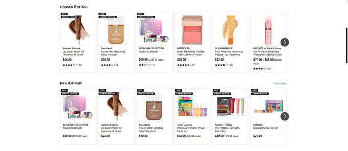 Furthermore, Sephora’s personalization engine provides category-based suggestions. By recognizing the types of products a customer typically purchases, whether in skincare, makeup, or fragrance, the system can recommend related items within these categories and suggest complementary products to enhance their beauty routine.