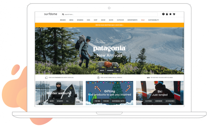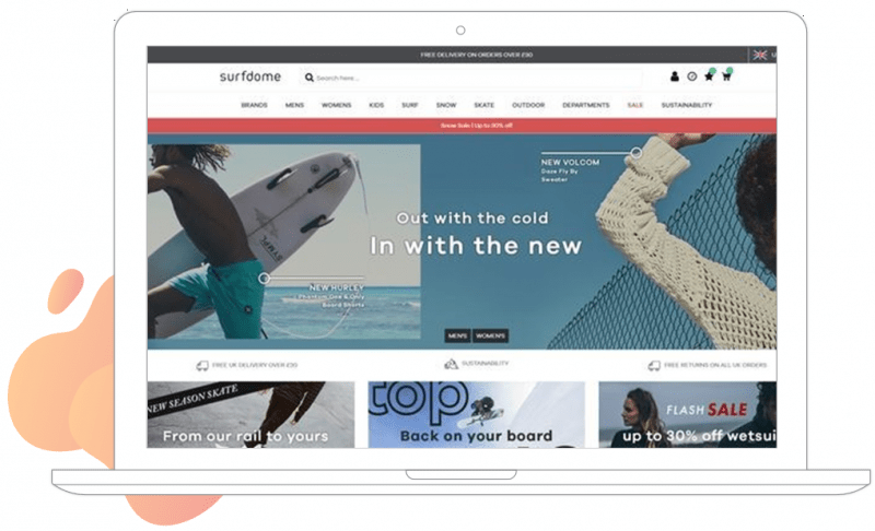 Surfdome uses a bright orange banner on the homepage to promote the release of their winter gear, as well as highlighting their range of winter wetsuits and ski products on their eCommerce website.