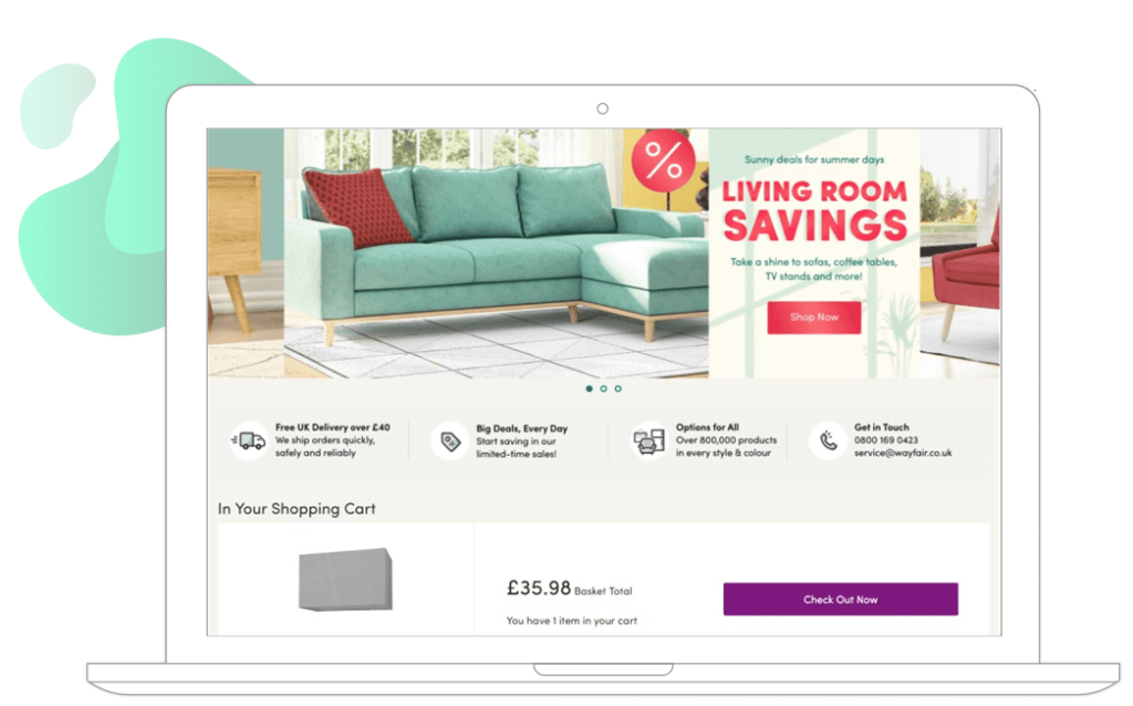 Wayfair features carted products on the homepage to encourage customers to check out. It’s important to include the main product details such as image and price, so the customer can quickly decide to complete the purchase.
