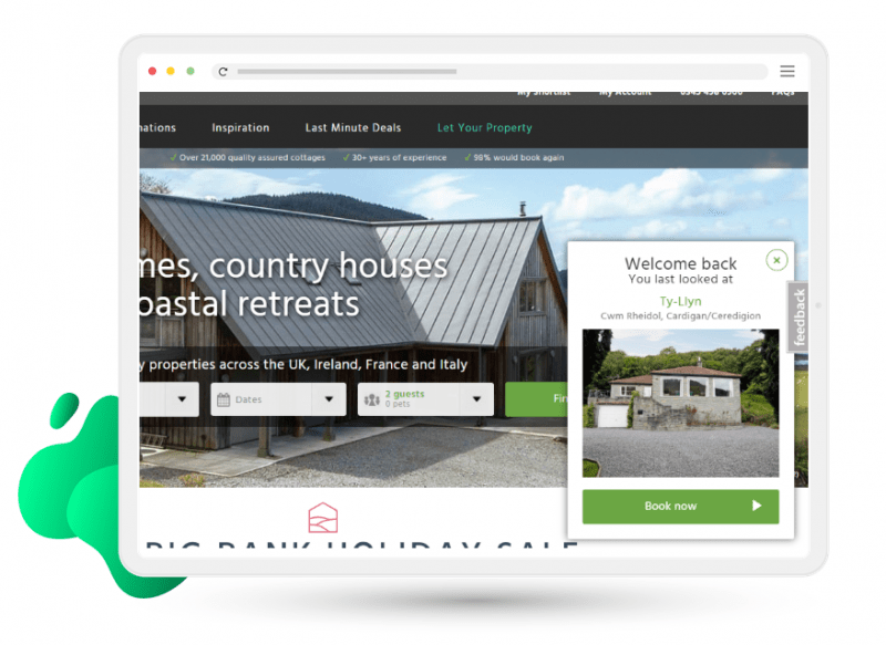 Cottages.com uses a popover to remind visitors of their last viewed product, including an image of the product to help jog their memory. Shoppers will appreciate the gesture, as they don’t have to waste time finding the product they searched for last time.