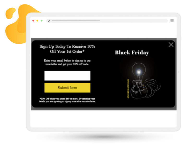 LSE Retail, a retailer selling lamps, made use of a special popover themed for Black Friday on their Iconic Lights website. The black background fits the theme perfectly, with the glowing lamp fitting for the company itself. Their new customer sign ups increased by 75% over the two months they displayed this popover.