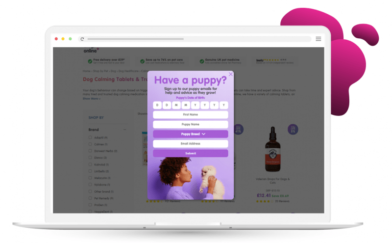 Pet Drugs Online show a popover to collect data relevant to their products and the customer’s needs. By asking the customer if they have a puppy, the puppy’s breed and its name, the company can send tailored product recommendations and messaging via email as the puppy grows into an adult dog.