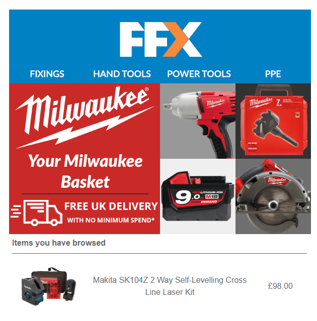 Leading hand and power tools provider FFX added dynamic hero banners to their cart and browse abandonment emails, showing customers images based on the make of the carted product and product recommendations from the same manufacturer. The emails achieve an impressive click to open rate of 45%. (Learn more about personalized product recommendations in our guide).