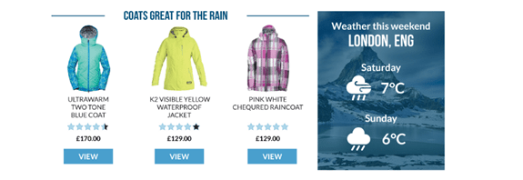 A different piece of dynamic content can be shown depending on a shopper’s place in the buying journey, lifecycle stage, preferences, location, weather forecast, time of day, or a combination of all of these.