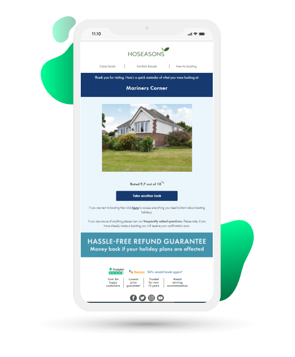 Since setting up their browse abandonment emails, Awaze has been testing deployment times to compare the difference in performance between sending the first email 15 minutes, 30 minutes or 60 minutes after abandonment. After one month, the team found that browse abandonment emails sent 15 minutes after abandonment yield the best conversion rate for their cottages.com and Hoseasons brands.