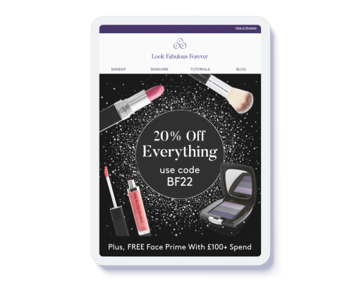 The beauty brand, Look Fabulous Forever leverages behavioral targeting to ensure a consistent shopping experience across all channels (website, email, social media).