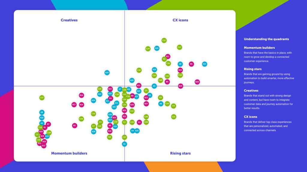 - Creatives are brands that stand out with strong design and content, but have room to integrate customer data and journey automation for better results