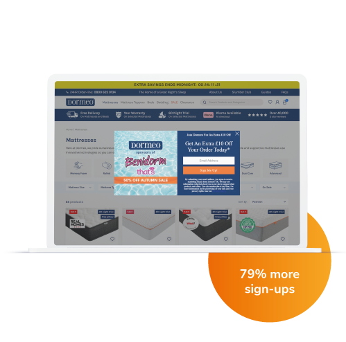 Dormeo captures customer data using Fresh Relevance popovers. “We used to have a pop-up on our homepage, but since using Fresh Relevance we’ve switched to a targeted popover on our PDPs, which has led to 79% more sign ups,” says Matthew.