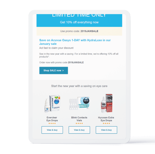 In addition to helping with new acquisitions, Vision Direct has introduced Fresh Relevance dynamic content SmartBlocks in its marketing emails, which are sent via its email service provider dotdigital. SmartBlocks prominently positioned within the body of the email are automatically populated with relevant and personalized product recommendations. They include recently viewed products and latest purchases, as well as social proof, such as crowd-sourced information on what other people have been recently looking at on the website. The impact of these product recommendations on click-throughs has been impressive with the company recording a 557% increase.