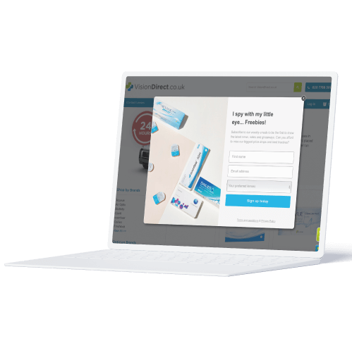Customers buying contact lenses tend to remain loyal repeat customers, so when a visitor arrives on the website they are either interested in becoming a Vision Direct customer, or are looking to place a repeat order. However, in order to be able to engage with new prospects via email, shoppers must voluntarily provide their email address. Working with the Fresh Relevance services team, Vision Direct set up, tested and fine-tuned a best-of-breed GDPR compliant email acquisition initiative using popovers. Now, when a new customer visits the Vision Direct website, they are presented at the opportune moment with a pop-up encouraging them to register their details.