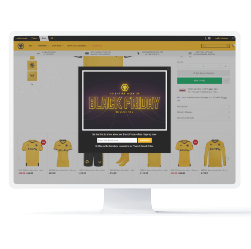 Wolves has set up several data capture popovers with Fresh Relevance, including sign up campaigns ahead of major product launches, such as the new kits for the upcoming season.