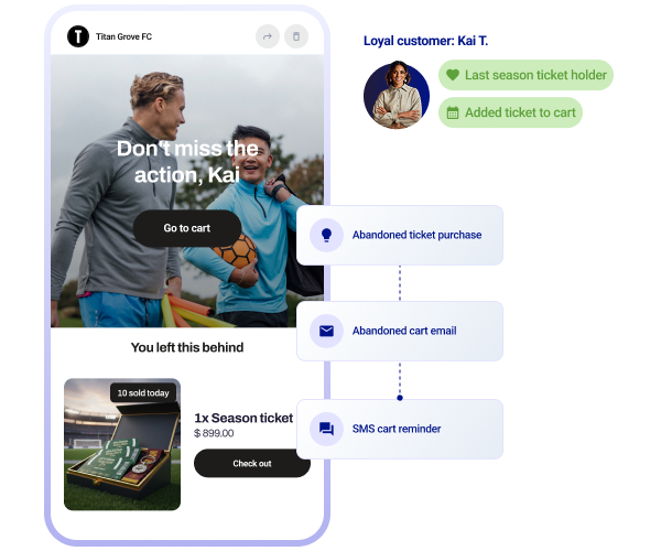 Recoup lost revenue with automated ticket abandonment messages that remind fans to complete their purchase. Create urgency to help sell out games using countdown timers and discount coupons.
