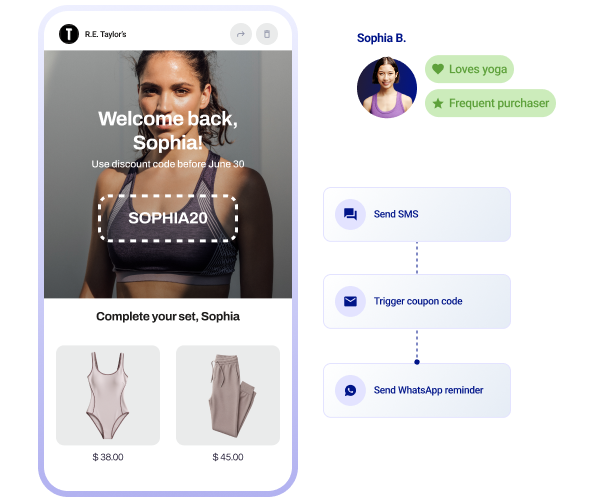 Sync across channelsLaunch and measure marketing campaigns that span email, web, SMS, WhatsApp and in-app.